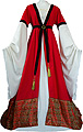 This eye-catching costume features a golden braid on two-coloured materials. The braid is 2.5cm wide, and runs all the way from the shoulder down to the hem – the upper arm piece resembles a traditional bracelet.